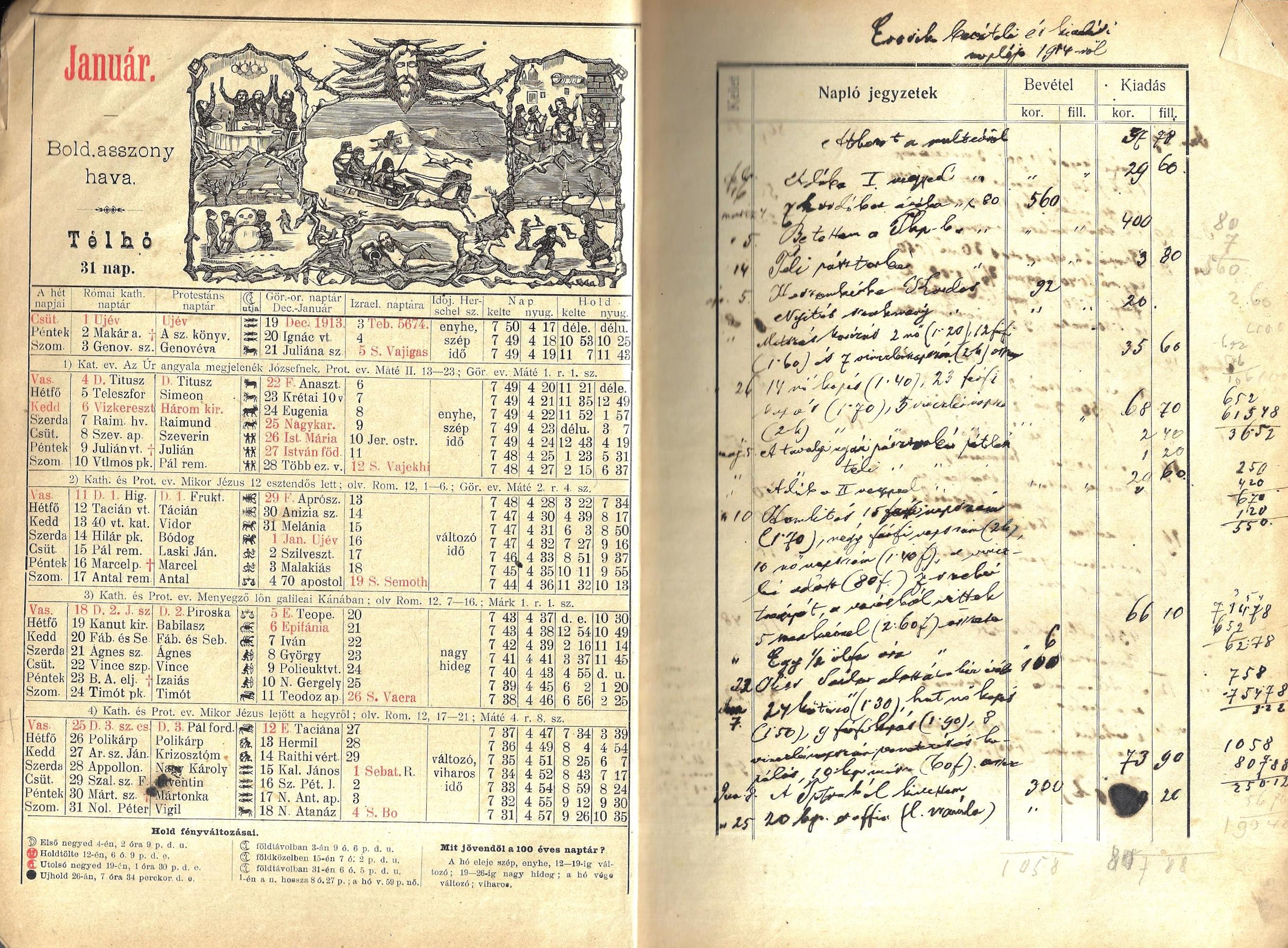 | Harmincegyedik évfolyam. A címlap és a naptárrész kétszínnyomású. A naptár jelentős része az un. "Hivatalos rész"; adattárak. Hátul az országos vásárok jegyzéke, majd hirdetések. Fűzött, eredeti borítékban, a jegyzetelésre szánt lapok közül, egy levélen tintával írt feljegyzések "Erzsike bevételi és kiadási naplója 1914-ből". |