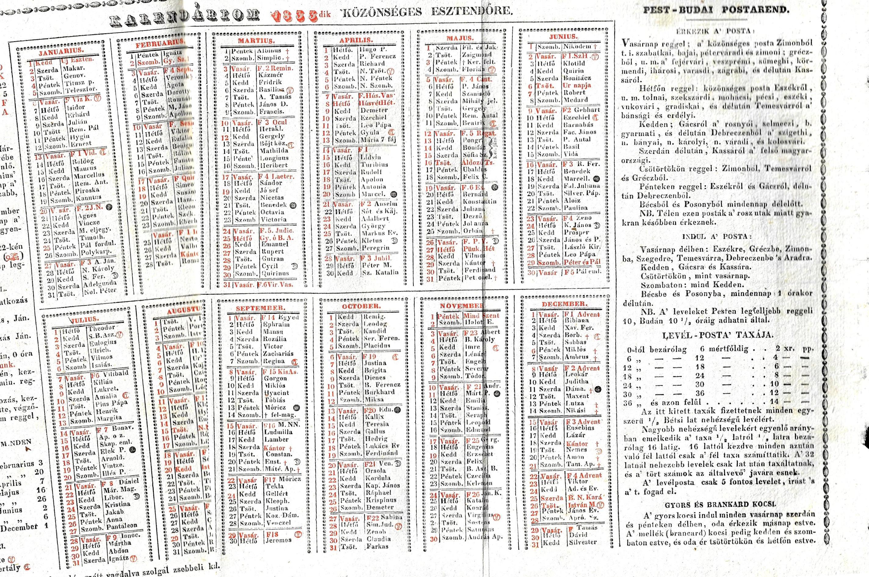 | BOEH 32. Második esztendei folyamat. A naptár melléklete egy falinaptár, melyet felvágva (mint írja) zsebnaptárként is lehet használni. Ez általában hiányozni szokott. A címkép, egy színezett kőnyomat a Ludovikáról, a 118. oldalon a Hymnus szövege. Kiadói, kissé viseltes papírkötésben. |