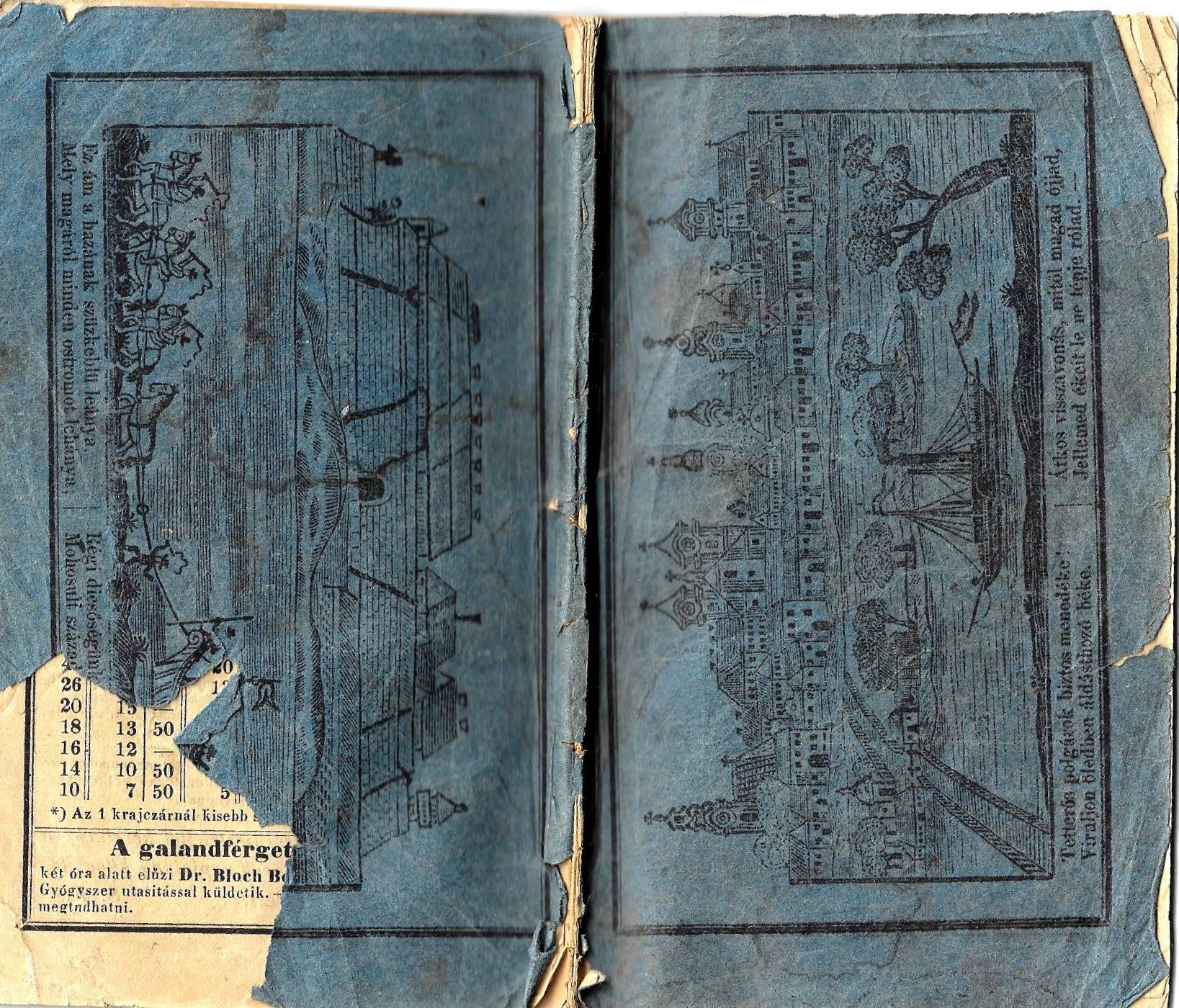 | "Tartalma:Szokott naptári tárgyak, népdalom, adomák. Írta Ny.A. " Kétszínnyomású címlap és naptár. Naptárversekkel. Fűzött, eredeti borítékban, a hátsó bal alsó sarkából letéptek egy darabot. A címlapon naptárbélyegző, A borítékon elől-hátul komáromi látkép, belső oldalon versezet. |
