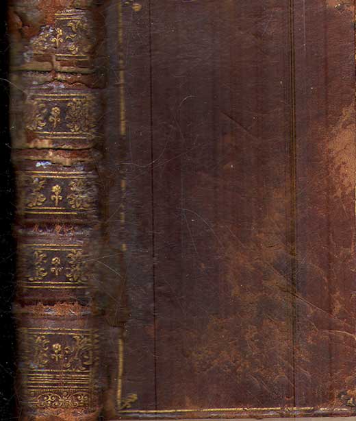 Az egyetlen ismert teljes példány. Korabeli, bordázott, aranyozott gereincû kötése felül sérült, mely a háttáblára is kiterjed, körben vörös metszéssel. |