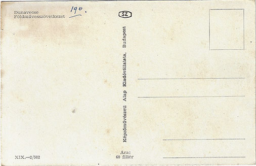| Osztott címzésű, monokróm képeslap, utcakép. A verzó bal alsó sarkában: XIX-2/582. Postatiszta, a verzón a gyűjtő sorszáma. |