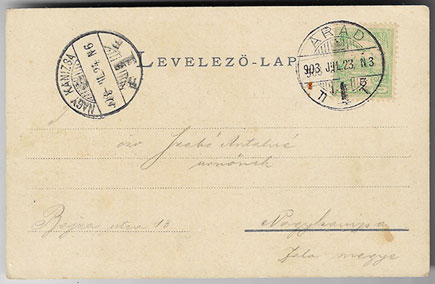 Hosszúcímzésú, színes képeslap. Postán futott, a ceruzával megírt lap 1903. julius 23.-i datálással Nagykanizsára címzett.