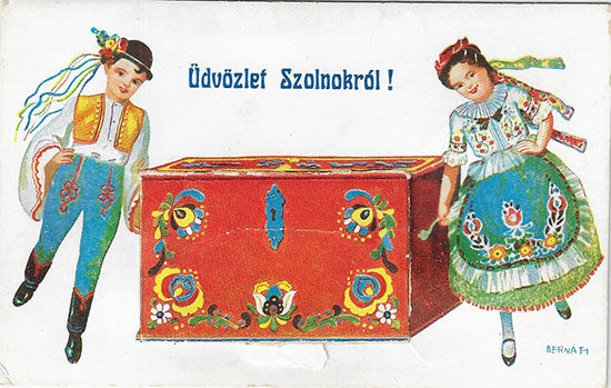 | Magyar ruhás fiú és lány tulipános ládával sorozat egyik darabja, tíz fekete-fehér képből álló leporellóval. Postatiszta, a verzón ceruzával írt, keltezett (1941. augusztus 25.) sorok. |
