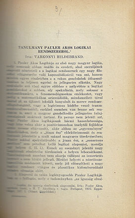 Várkonyi Hildebrand Dezső: Tanulmány Pauler Ákos logikai rendszeréről