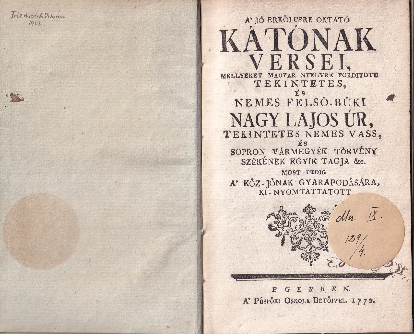| Egerben, 1772, Püspöki Oskola Betűivel. [48] p. 174 mm |