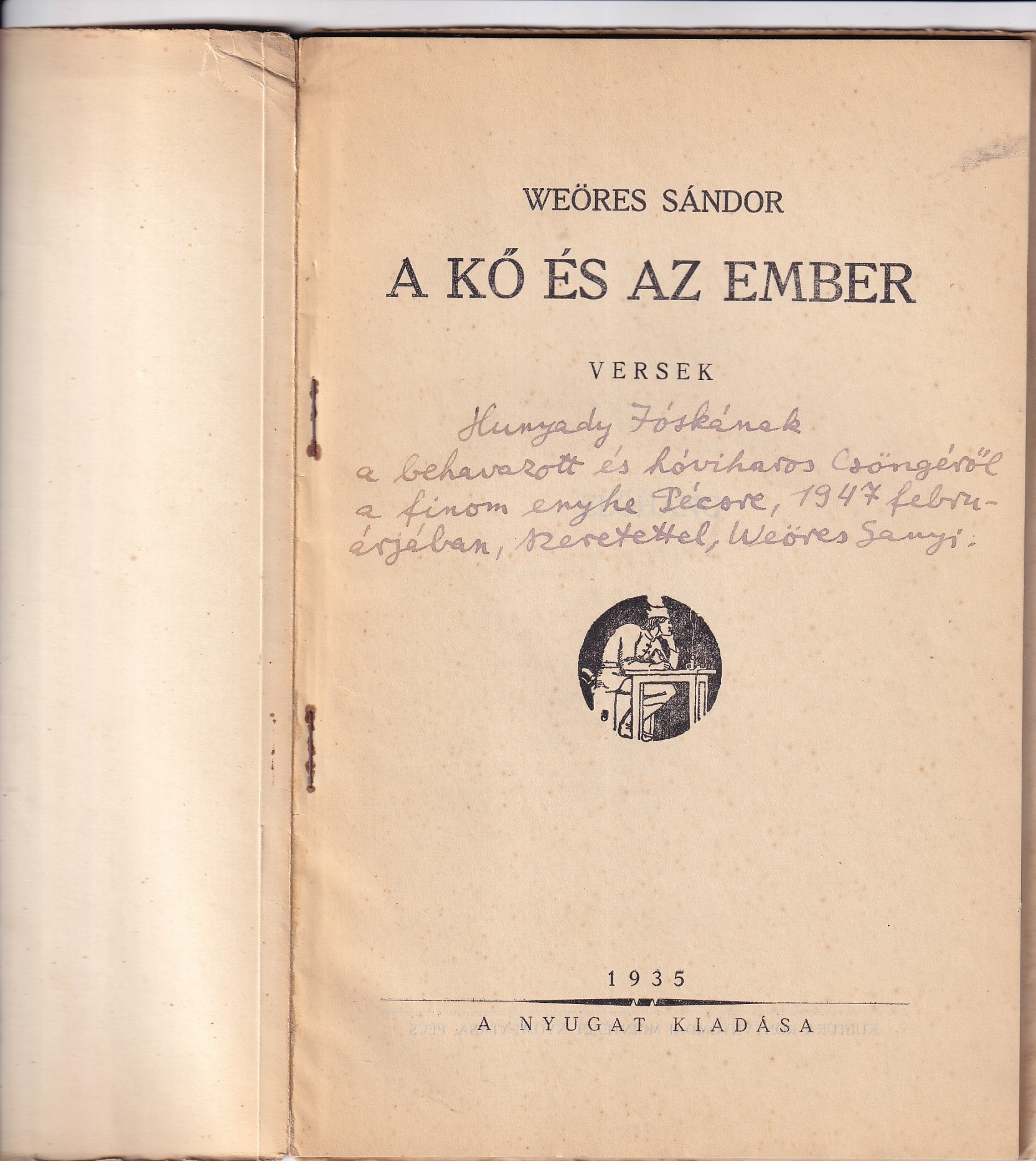 | Tezla 4158. Első kiadás. A költő második kötete, a Nyugat égisze alatt jelent meg, fémjelezve az első verseskönyv kedvező fogadtatását, verseinek irodalmi értékét; Baumgarten-jutalomban részesült.. Tűzött, eredeti borítékban, a címlaspon szerzői dedikáció Hunyady József [1921-1983] írónak. Dedikált: „Hunyady Jósknak / a behavazott és hóviharos Csöngéről / a finom enyhe Pécsre, 1947 febru-/árjában, szeretettel Weöres Sanyi” |