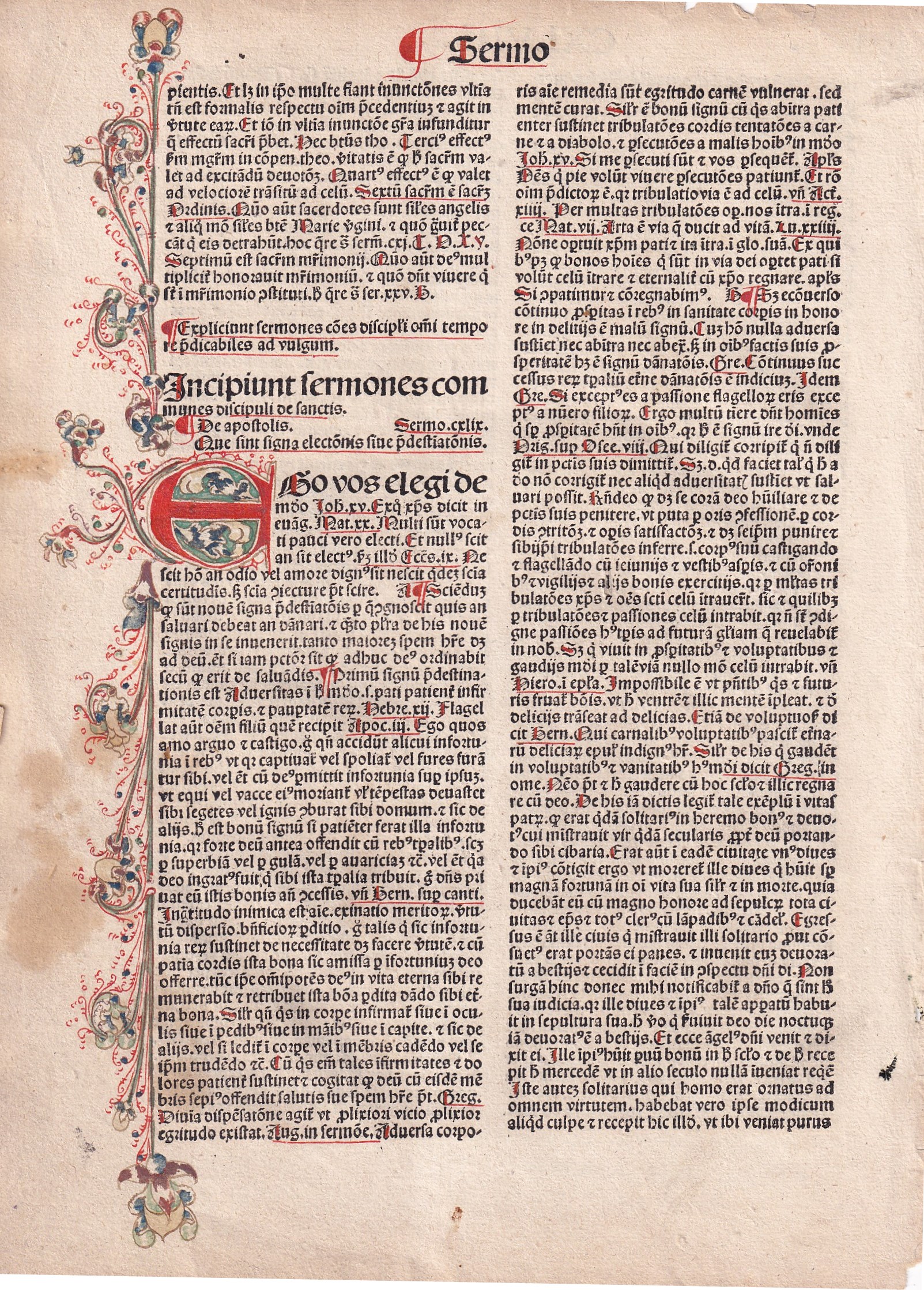 Folio, kéthasábos szedéssel, a rektó vörössel rubrált, a verzón szép kézzel festett iniciáléval, bal oldalt kézzel festett elegáns, folyondárszerű díszítés végig a nyomtatott szöveg mellett. |