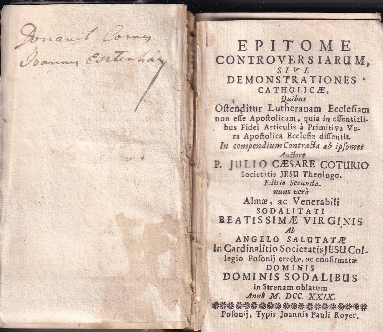| Posonii, (M. DCC.XXXIX [1729], Typis Joannis Pauli Royer. [14], 526, [3] p. 128 mm |