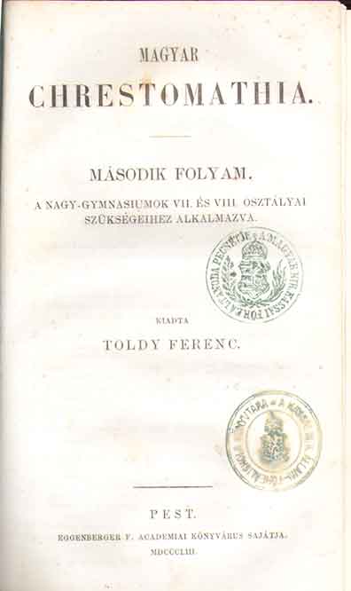 | Első- második évfolyam. A nagy-gymnaeumok V.és VI. valamint a VII. és VIII. osztályai szükségeihez alkalmazva. Több nem jelent meg. A két rész egybekötve, korabeli félvászon kötésben, a címlapokon tulajdonbélyegzők, első három levelén tintafolt. |