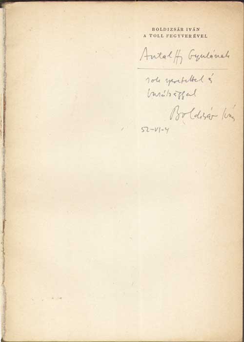 | Fűzött, eredeti borítékban, a szerzői dedikáció a szennycímlapon. Dedikált: „Antalffy Gyulának / sok szeretettel és / barátsággal / Boldizsár Iván / 52-VI-4” |
