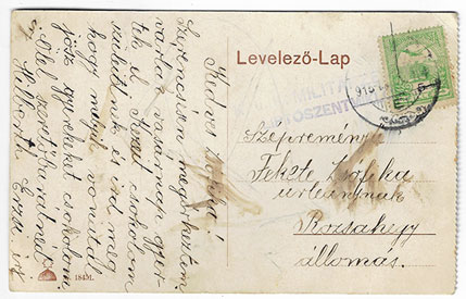| Osztott verzójú, színes képeslap, a verzó bal alsó sarkában szignet és sorszám (18451), a rektón piros színnel nyomtatott felirat. Postán futott, a rózsahegyi állomásra címzett. Bal oldalt fogazott. |