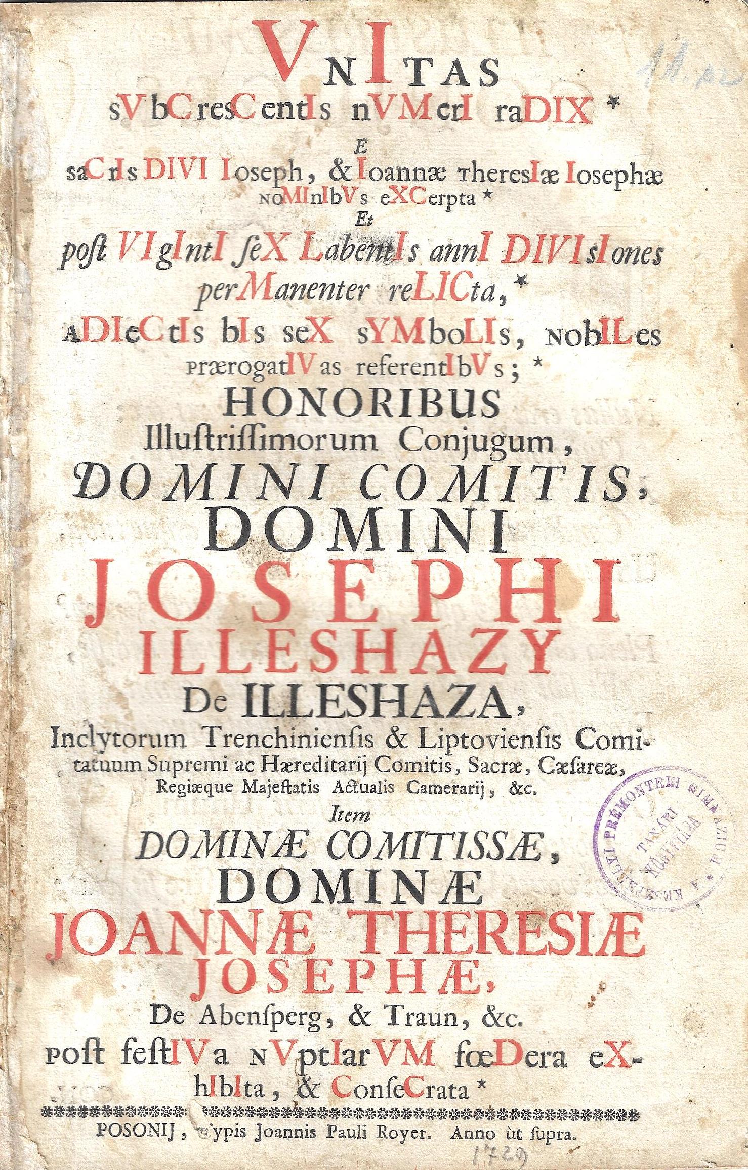 | Unitas subcrescentis numeri radix e sacris Divi Ioseph, [...] Josephi Illésházy item [...] dominae Joannae Theresiae Josephae, de Abensperg, &Traun, [...] post festiva nuptiarum foedera exhibita, & consecrata |