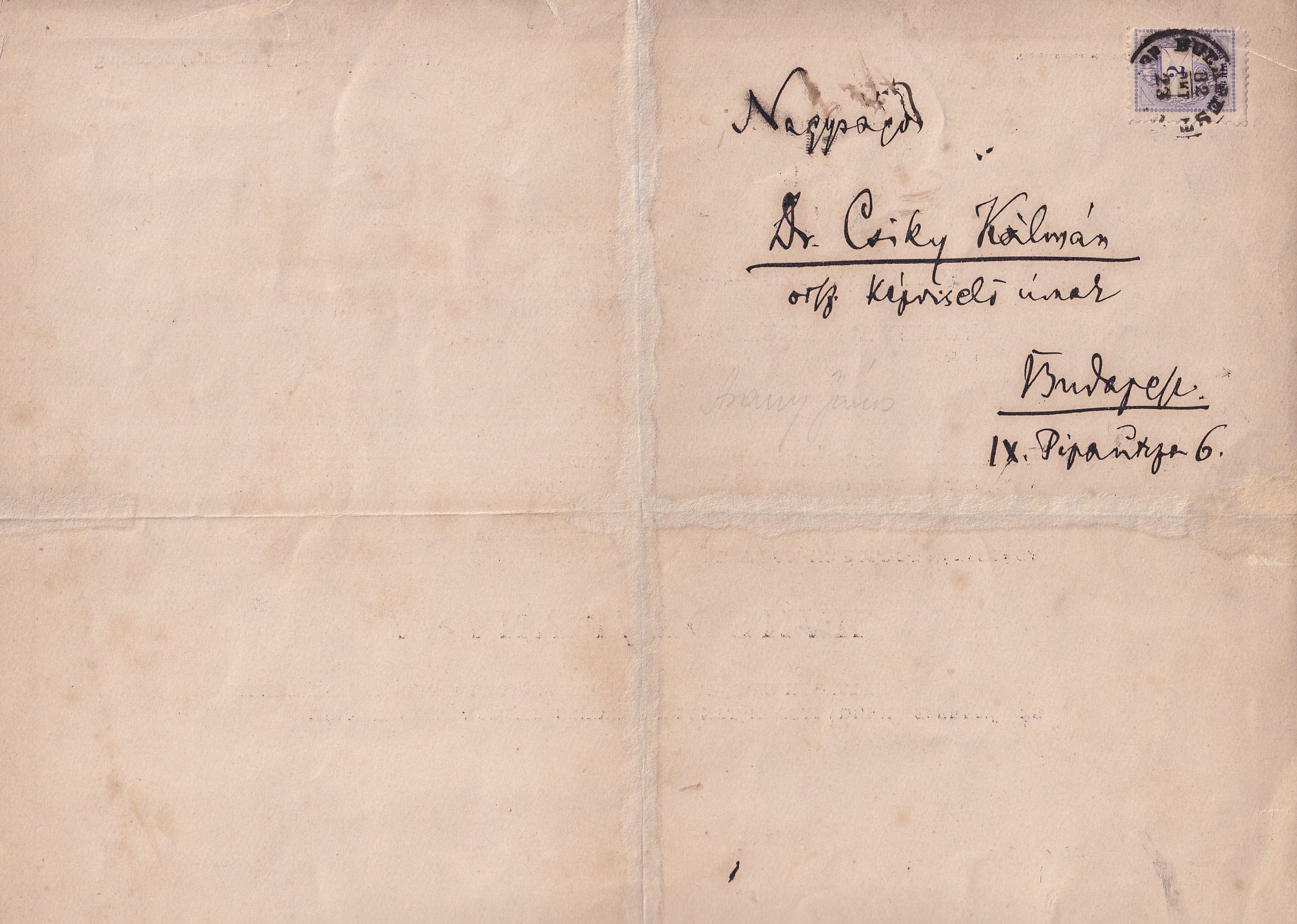 | Gyászkeretes levélen a szöveg a rektón, a verzó üres:"Mélyen szomorodott szivvel jelentjük családunk szerető és / szeretett férjének, a legjobb férj, atya, após és nagyatya / Arany Jánosnak, / [...] elhunytát. [...]". Függőleges és vízszintes hajtás nyomával, postán futott, bérmentesített, címzése: Tekintetes Csiky Kálmán orsz. képviselő úrnak / Budapest / IX, Pipa utcza 6. A verzón a hajtogatásoknál megerősítve. |